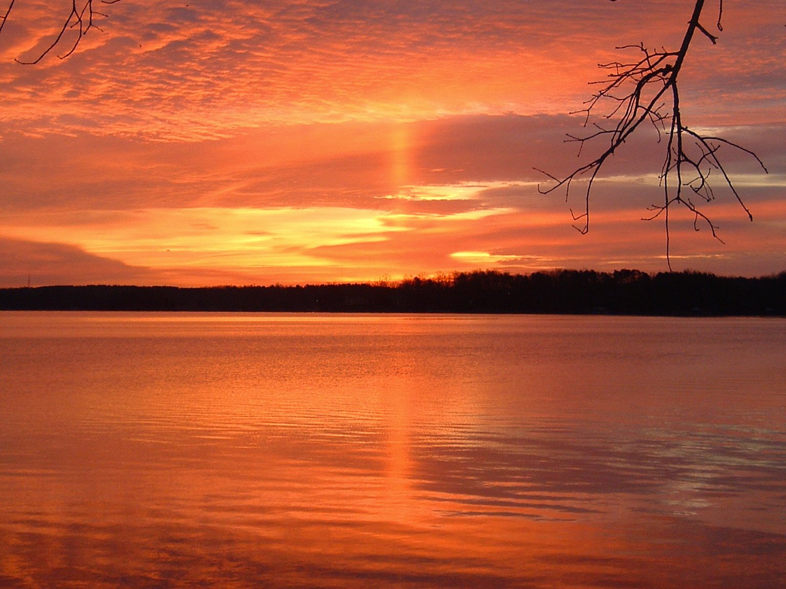 Beschreibung: Haben Sie schon einmal eine Sonnensäule gesehen? Wenn die Luft kalt ist und die Sonne auf- oder untergeht, können fallende Eiskristalle das Sonnenlicht reflektieren und einen ungewöhnlichen Lichtpfeiler bilden. Eis bildet manchmal flache, sechsseitige Kristalle, wenn es aus hoch liegenden Wolken fällt. Der Luftwiderstand verursacht, dass diese Kristalle die meiste Zeit fast flach liegen, während sie zum Boden wedeln. Sonnenlicht wird von Kristallen reflektiert, die genau ausgerichtet sind, was den Sonnensäulen-Effekt erzeugt. Auf diesem Bild von 2007 reflektiert eine Sonnensäule das Licht eines Sonnenuntergangs über dem Lake Norman in North Carolina (USA).