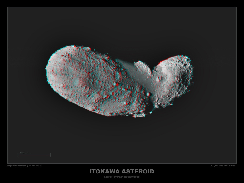 Das Stereobild entstand aus Bildern der Raumsonde Hayabusa, die im Jahr 2005 den Asteroiden besuchte. Nach einer langen Reise trat die Raumsonde am 13. Juni über Australien wieder in die Atmosphäre ein. Sie landete erfolgreich eine Kapsel an einem Fallschirm auf der Erde. Die Kapsel brachte eine kleine Probe vom Material des Geröllhaufen-Asteroiden Itokawa.