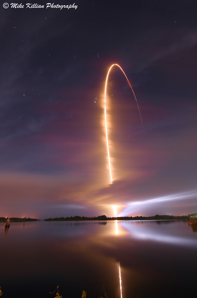 Die Szenerie spiegelt sich im Turn Basin. Das Bild entstand aus zwei Aufnahmen. Sie wurden fast 5 Kilometer vom Startrampenkomplex 41 entfernt fotografiert. Eine Aufnahme betont das dramatische Spiel aus Startrampenbeleuchtung, Wolken und Himmel. Eine zweite Aufnahme wurde 3 Minuten belichtet. Sie zeigt den Feuerschweif der Rakete.