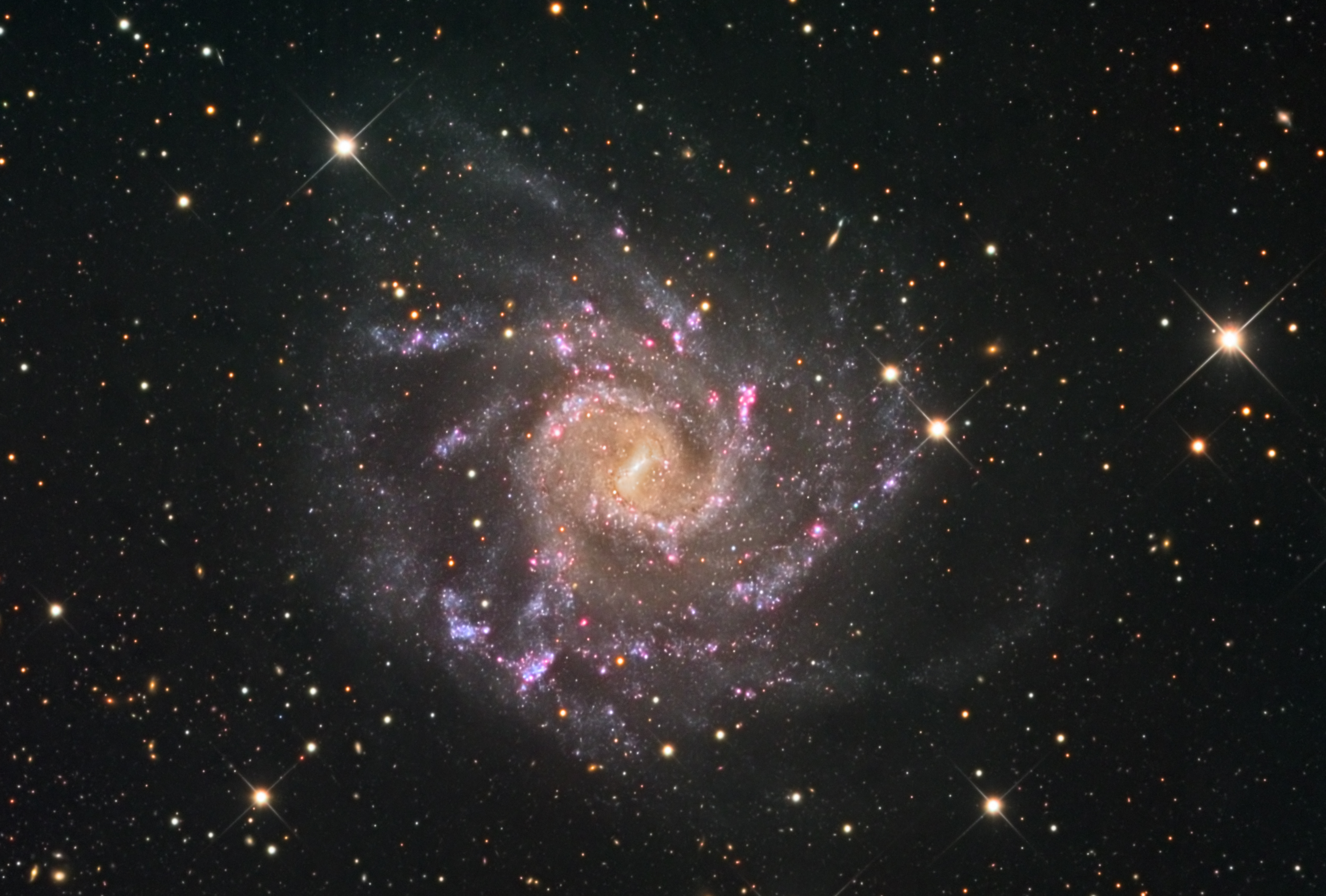 In den gewundenen Armen liegen viele helle Haufen mit massereichen jungen Sternen. Die Sternhaufen sind mehrere hundert Lichtjahre groß. Während in den Armen von NGC 7424 massereiche Sterne entstehen, vergehen sie dort auch wieder. In dieser Galaxie war eine mächtige Sternexplosion zu beobachten. Es war die Supernova SN 2001ig, die lange vor der Aufnahme dieses Bildes wieder verblasste.