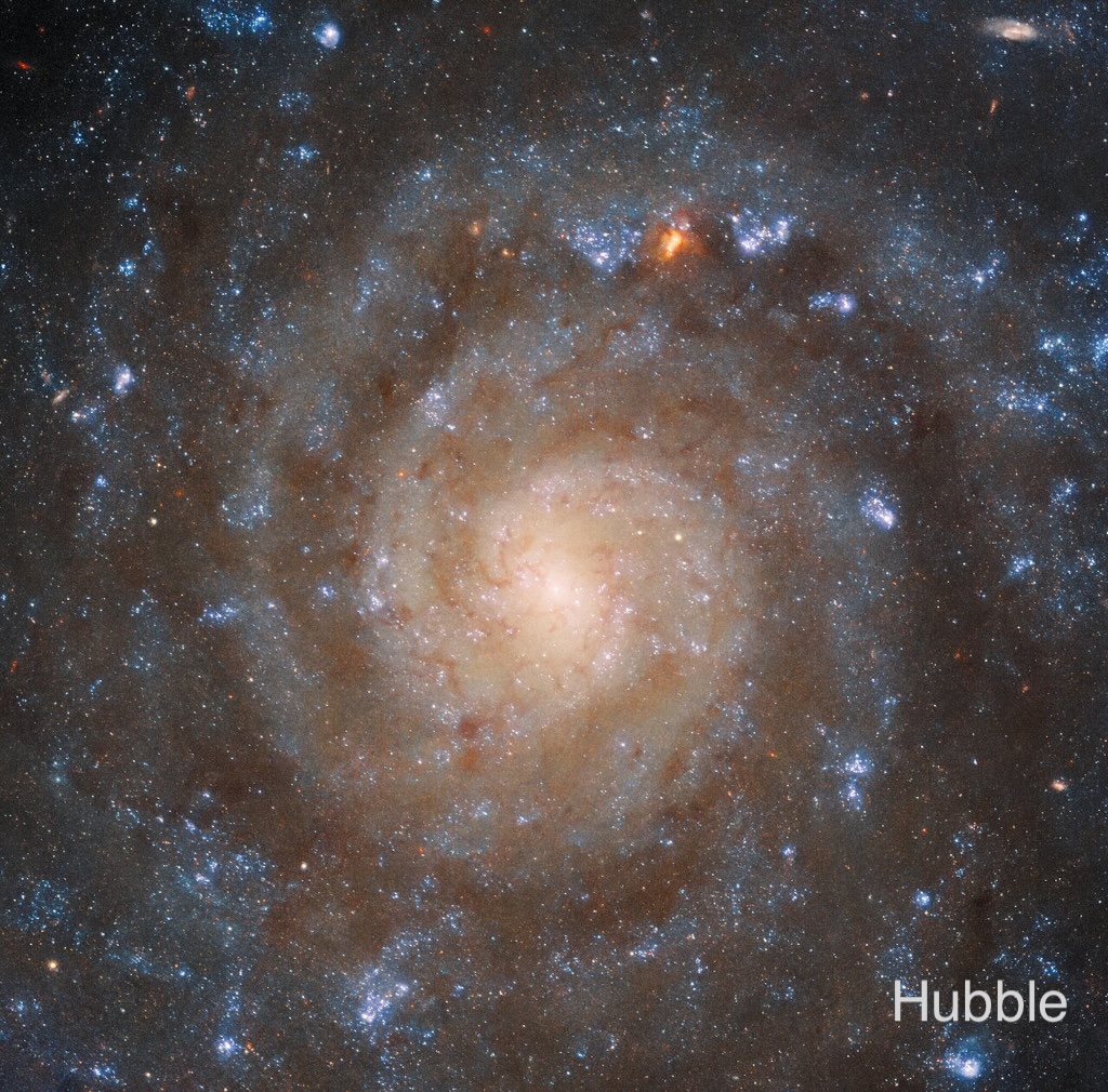 Das Hubble-Bild betont die Spiralarme der Galaxie. Sie sind durch dunkle Regionen voneinander getrennt. Das Webb-Bild offenbart dagegen eine feinere, stärker verflochtene Struktur. Interstellarer Staub streut und absorbiert das Licht der Sterne in der Galaxie. Das führt zu den dunklen Staubspuren im Hubble-Bild. Doch derselbe Staub strahlt Wärme im Infrarotlicht ab. Daher leuchtet er auf dem Bild von Webb.
